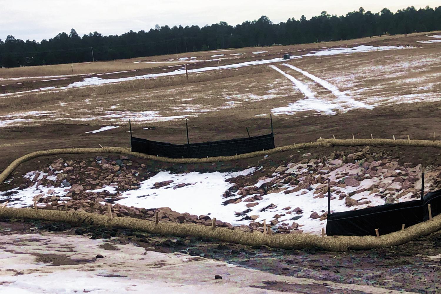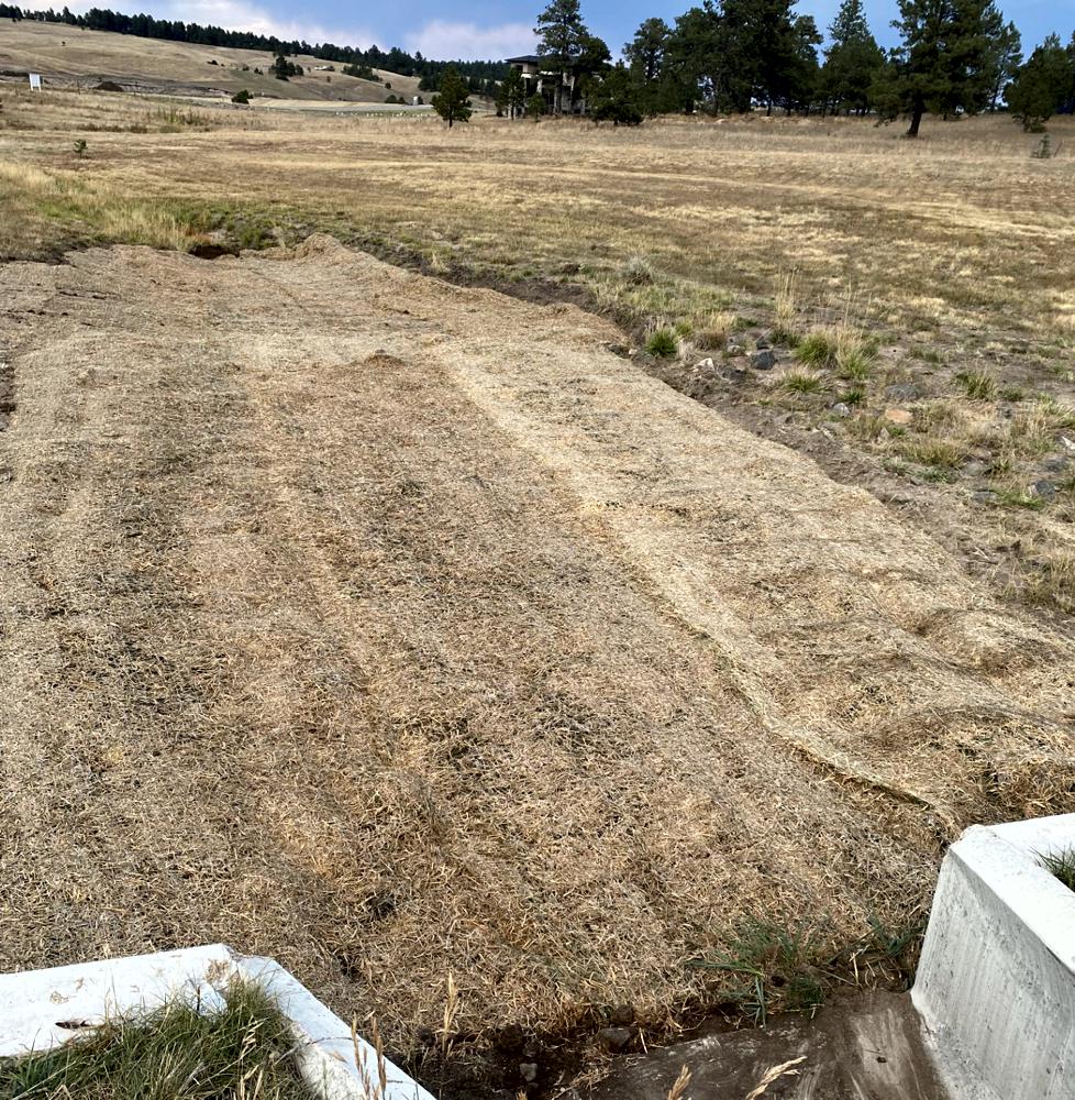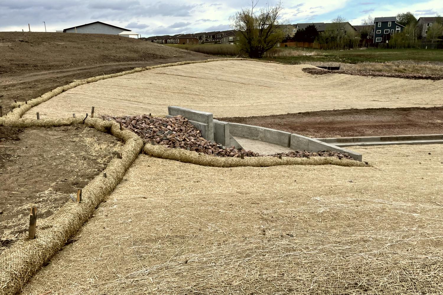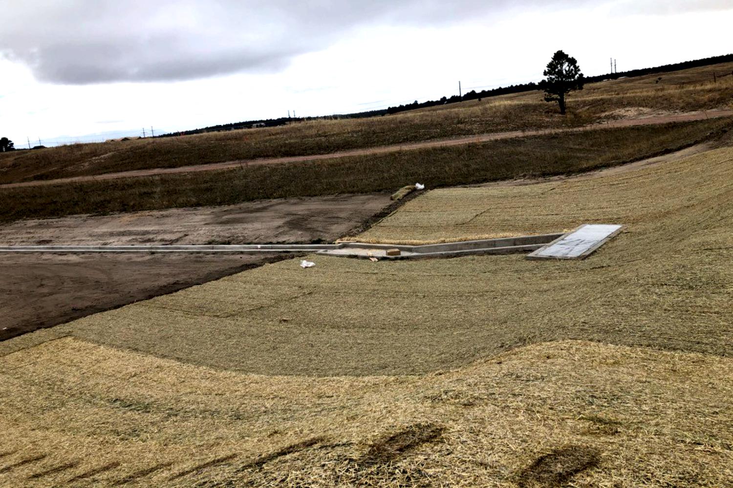 Erosion control in Colorado Springs. Erosion control in Colorado Springs, installed erosion control blankets to keep the seed bedded down, keep the dirt from moving in a rain storm and help the grass seed to germinate. The straw waddles were installed to prevent the dirt from up stream moving down onto the erosion blanket