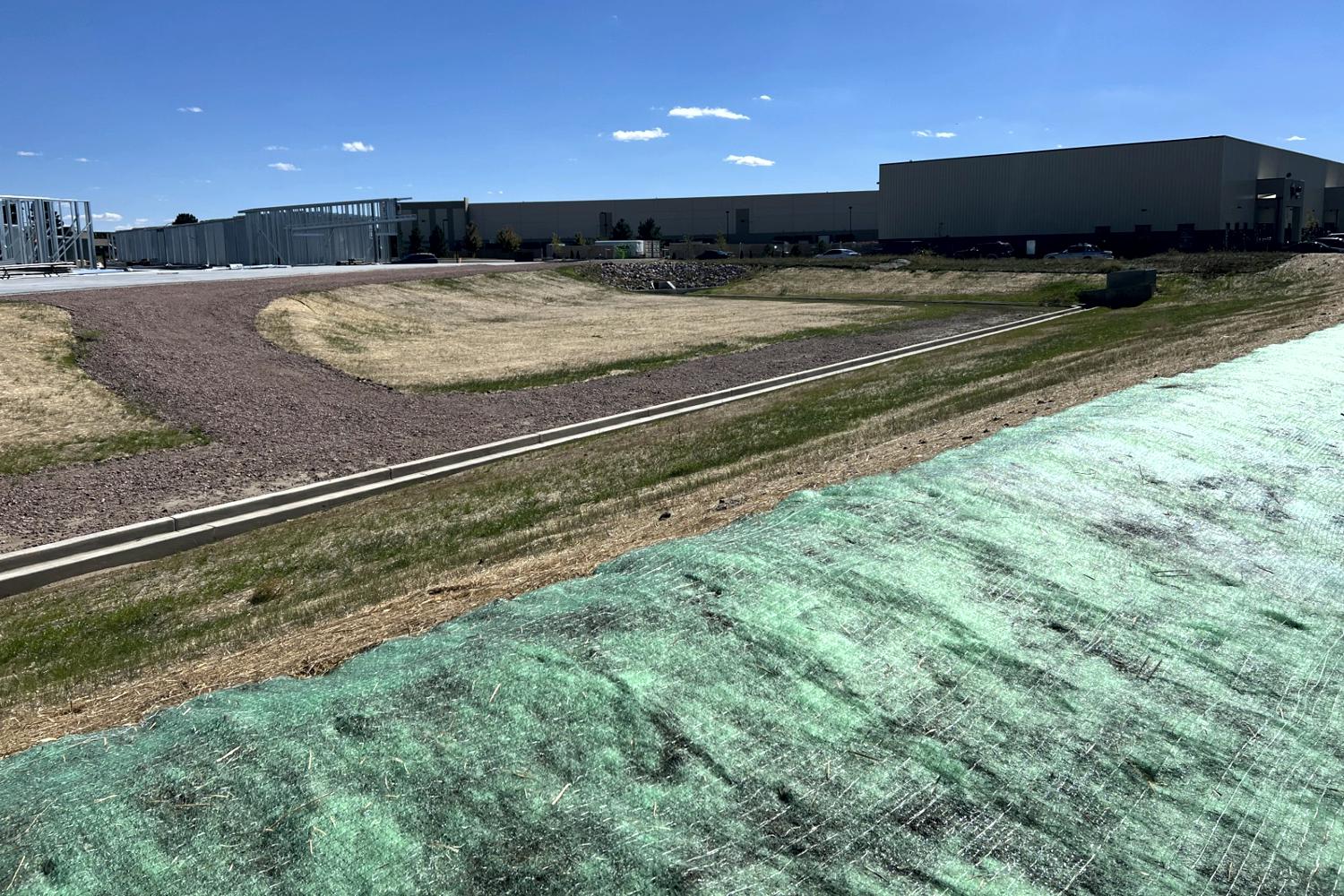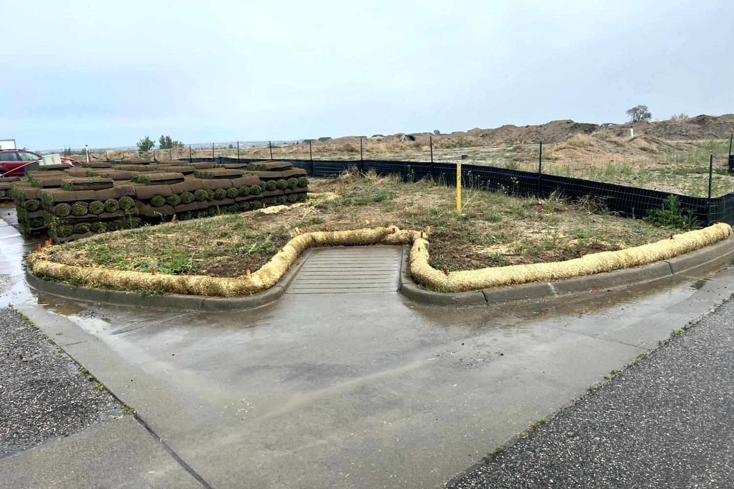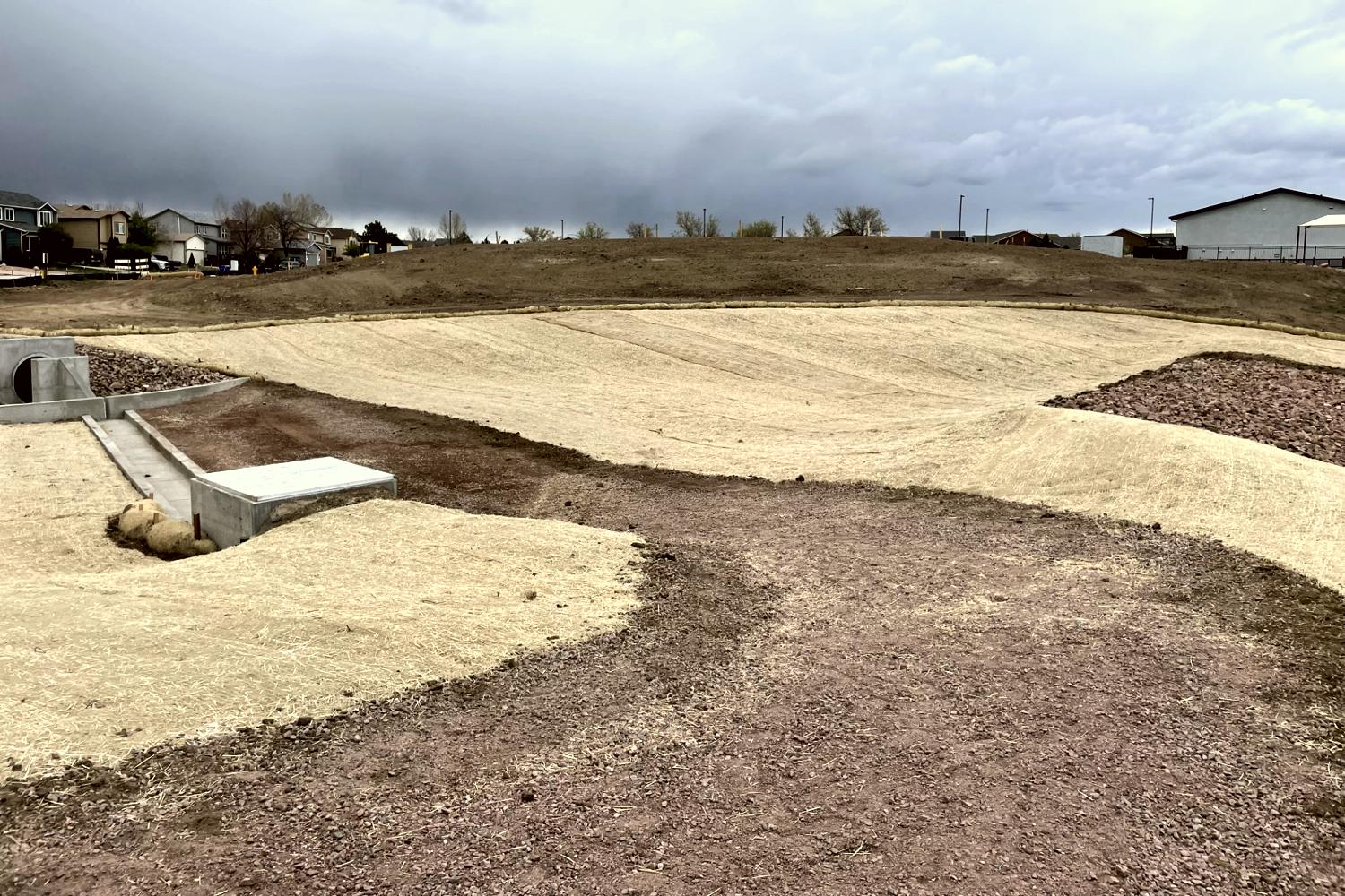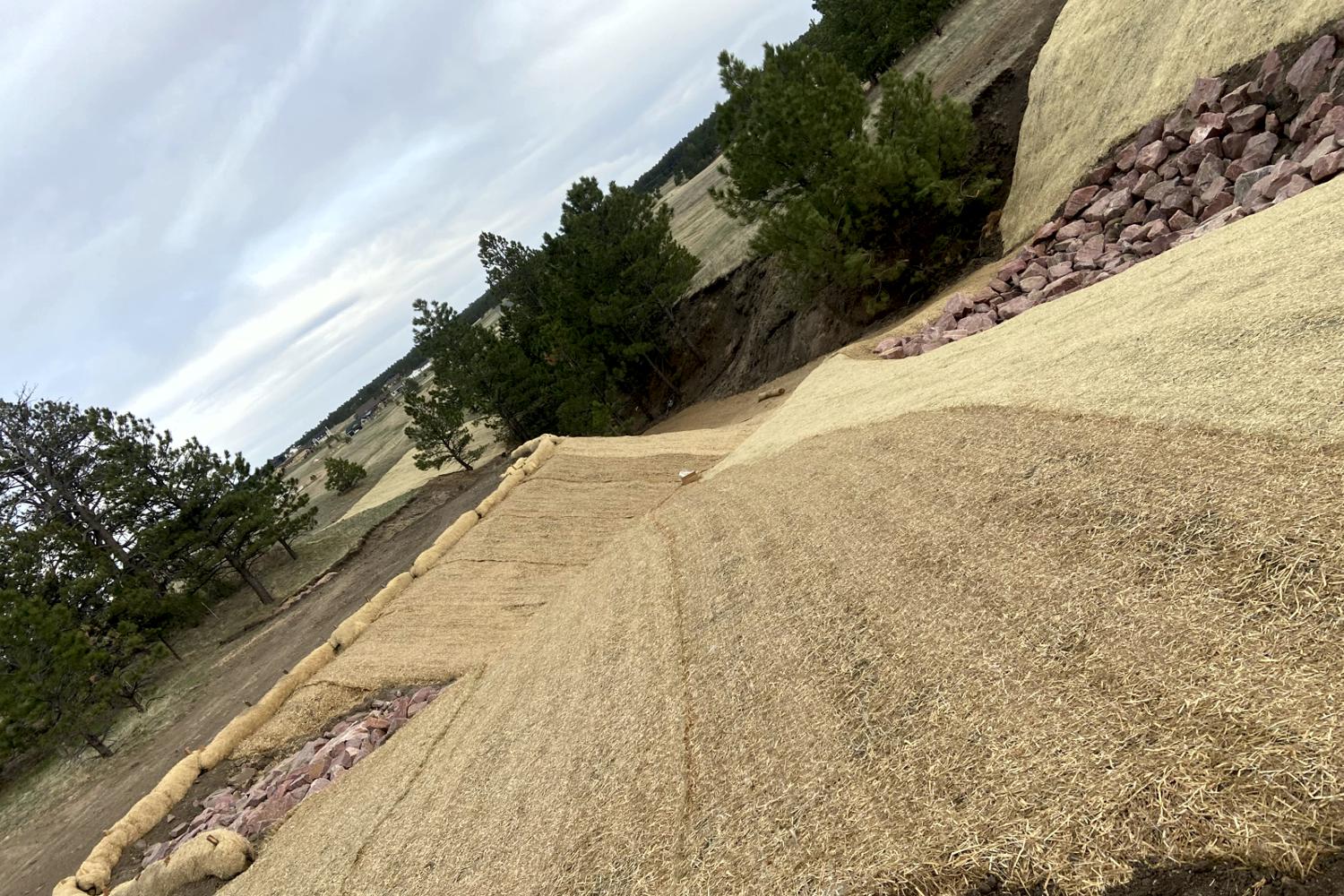 Erosion control in Colorado Springs. Erosion control in Colorado Springs, installed erosion control blankets to keep the seed bedded down, keep the dirt from moving in a rain storm and help the grass seed to germinate. The straw waddles were installed to prevent the dirt from up stream moving down onto the erosion blanket